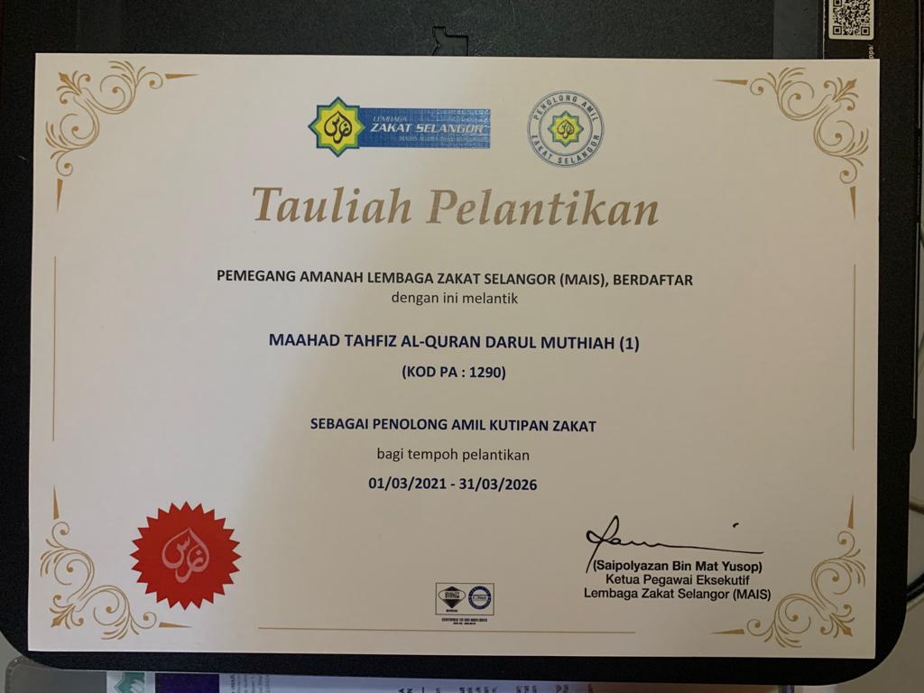 Bagi kelangsungan perjalanan Maahad Tahfiz ini, kami dengan rendah hati memohon tuan/Puan untuk menuniakan zakat melalui Maahad Tahfiz Al Quran Darul Muhtiah (1). Wang Zakat berkenaan akan didepositkan atas nama Lembaga Zakat Selangor (LZS), dikembalikan kepada Maahad Tahfiz Al Quran Darul Muthiah (!) sebanyak 50% dari kutipan untuk diagihkan kepada golonghan asnaf yang belajar diMaahad Tahfiz.